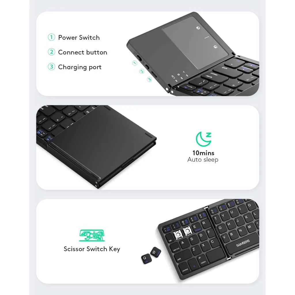 Work smarter and travel lighter with the Foldable Bluetooth Keyboard with Touchpad – a slim, stylish, and ultra-portable typing solution for your phone, tablet, laptop, or Mac. Whether you’re at home, in a café, or on the move, this rechargeable wireless keyboard gives you full-sized comfort in a compact, foldable design.